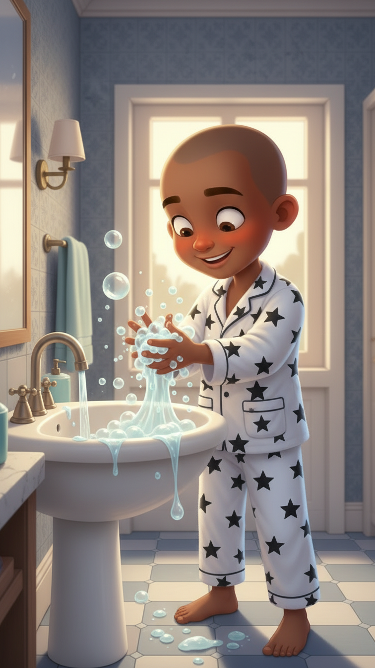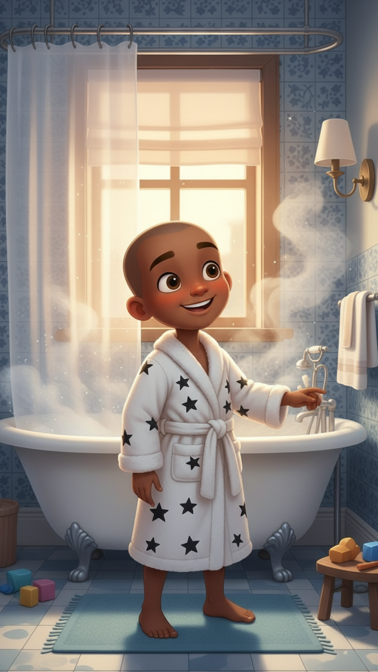 Late at night, when the world outside was quiet and still, Little Timmy stood in his bathroom, waiting for the water to heat up. He loved this part of his day the most. As the bathroom filled with warm steam, he stepped into the shower, letting the water cascade over his tired body. It felt like magic—washing away all the dirt, stress, and worries from the day. The warm water made his shoulders relax, and he felt lighter, as if the weight of the world was slipping down the drain.