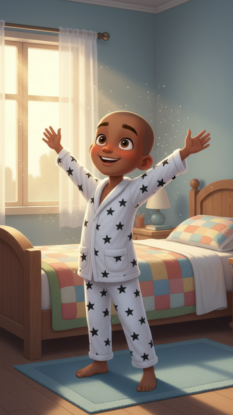 When morning came, Little Timmy opened his eyes, the sunlight peeking through his curtains. He stretched his arms wide and whispered, "Thank you for this new day." He had started saying this every morning because it made him feel happy.